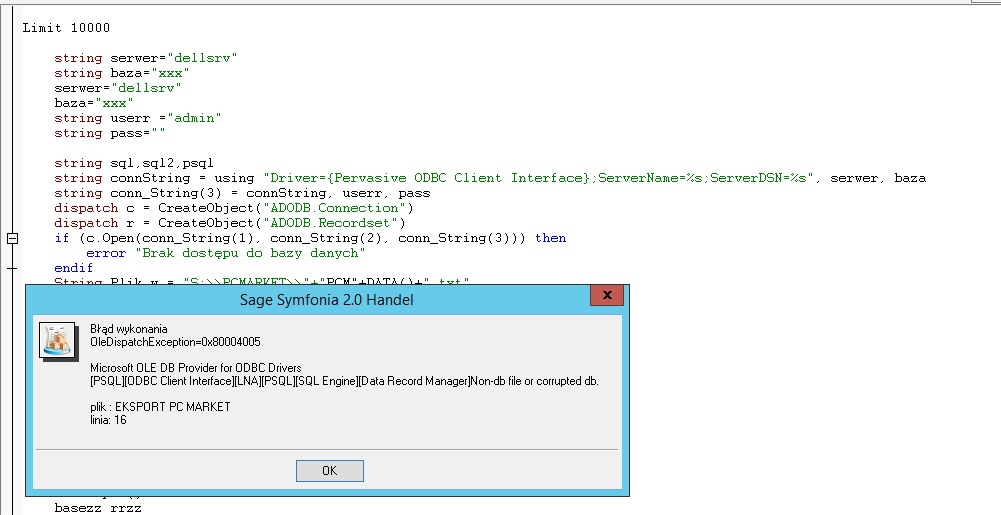 string userr ="admin" string pass="" string sql,sql2,psql string connString = using "Driver={Pervasive ODBC Client Interface};ServerName=%s;ServerDSN=%s", serwer, baza string conn_String(3) = connString, userr, pass dispatch c = CreateObject("ADODB.Connection") dispatch r = CreateObject("ADODB.Recordset") if (c.Open(conn_String(1), conn_String(2), conn_String(3))) then error "Brak dostępu do bazy danych" endif (wywala się na c.Open)