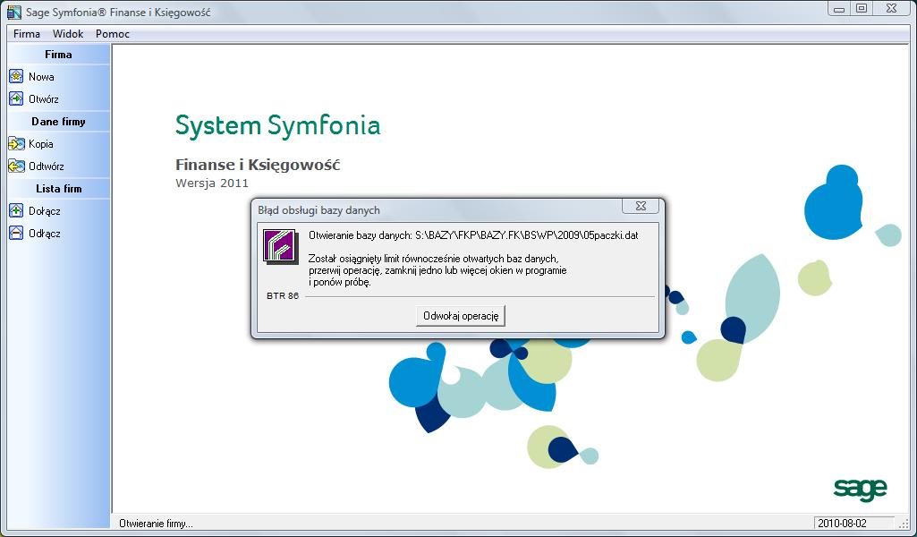 Przy logowaniu się do bazy danych przy pomocy dobrego hasła i loginu i dostaje błąd który jest widoczny w załączniku error.jpg " s:\costam\costam\05paczki.dat Został osiągnięty limit równocześnie otwartych baz danych" po odwołaniu operacji dostaje podobny monit z tą różnicą że dotyczy on pliku 08kspec.dat na koniec dostaje monit widoczny w załączniku error1.jpg "Baza danych z informacjami o firmie nie jest dostępna".