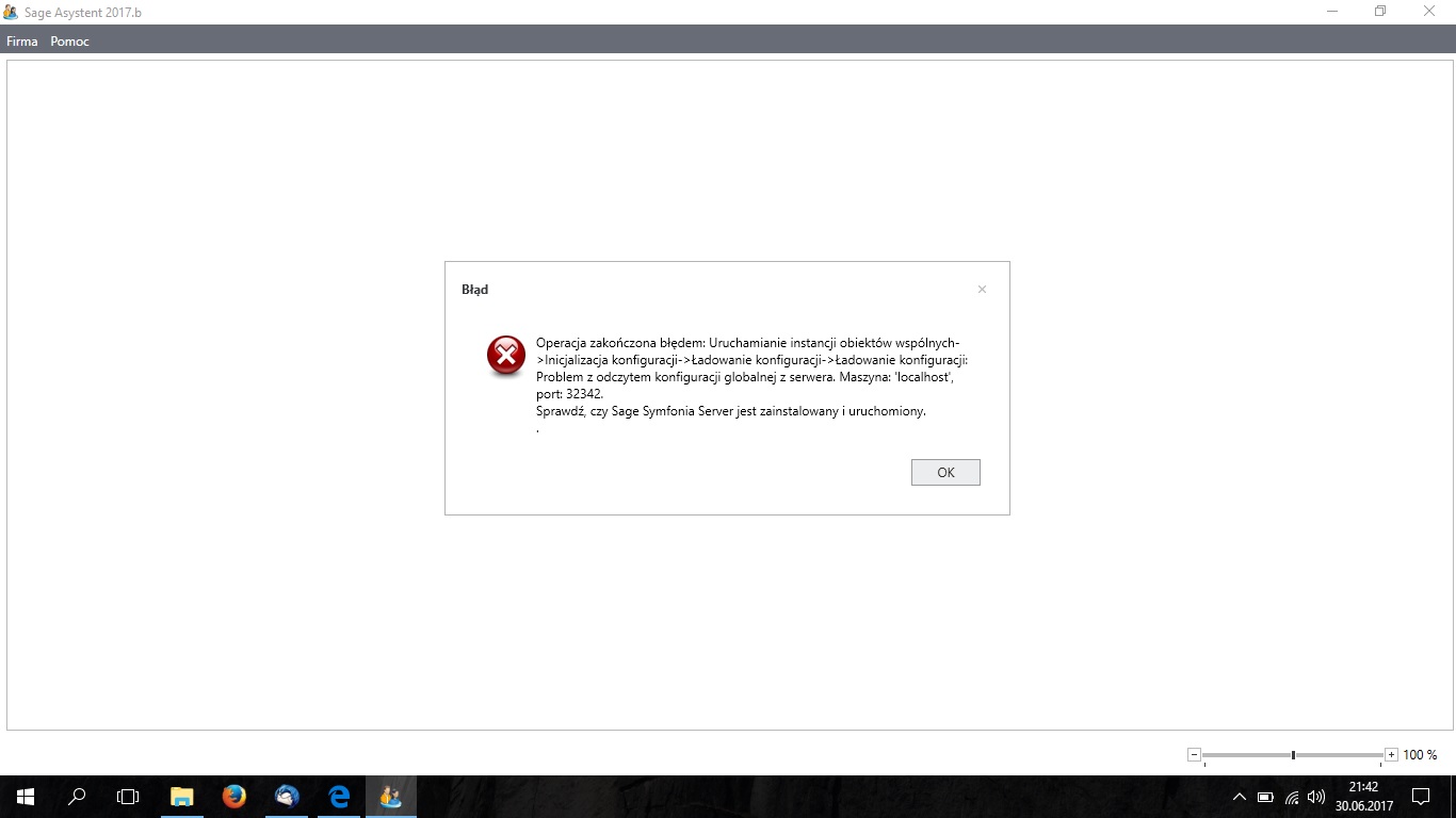 Asystenta w życiu nie używałem, ale przy innych programach widziałem podobne komunikaty. Przy starcie program próbuje się odwołać do usługi Sage Services, którą instaluje się na lokalnym komputerze lub w sieci, instalator powinien być na płytce (ta usługa to zwykle jeden z komponentów używany przy systemie ERP Symfonii). Z komunikatu wynika, że odwołuje się do localhost więc albo usługa nie jest uruchomiona, albo nie jest zainstalowana. A może macie ją na jakimś serwerze (tak zresztą powinno się jej używać) a przy instalacji ktoś wskazał domyślny localhost zamiast właściwy serwer?