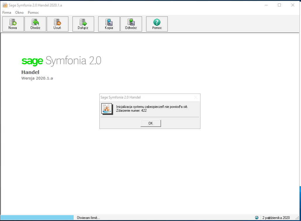 Wszystko ładnie, pięknie ale niestety przy otweiraniu firmy wyrzuca taki błąd: "Inicjalizacja systemu zabezpieczeń nie powiodła się. Zdarzenie numer:422".