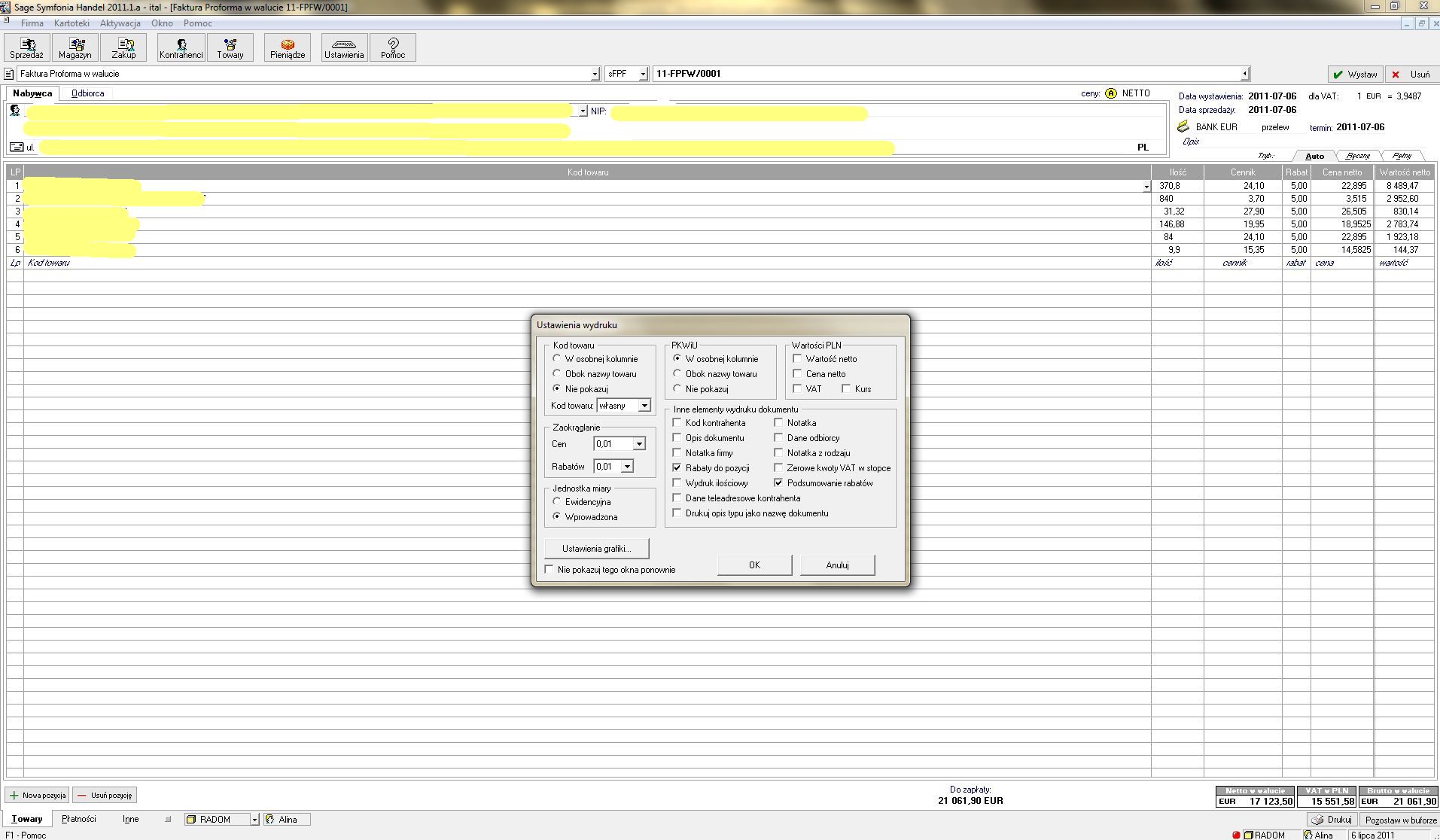 Próbuje wystawić fakturę proforma w walucie. Stworzyłam odpowiedni typ dokumenty (zamówienie obce w walucie). Wszystko jest ładnie pięknie. Dodaje towary, robię cenę i rabaty mam odpowiednią kwote netto, vat, brutto (rys. 1) (sprawdziłam tworząc taki sam dokument w excellu), ale gdy próbuje go wydrukować to pokazuje jedynie kwote netto i to uznając ja jako kwotę do zapłaty (rys. 2). Prosze o sugestie co robię źle.