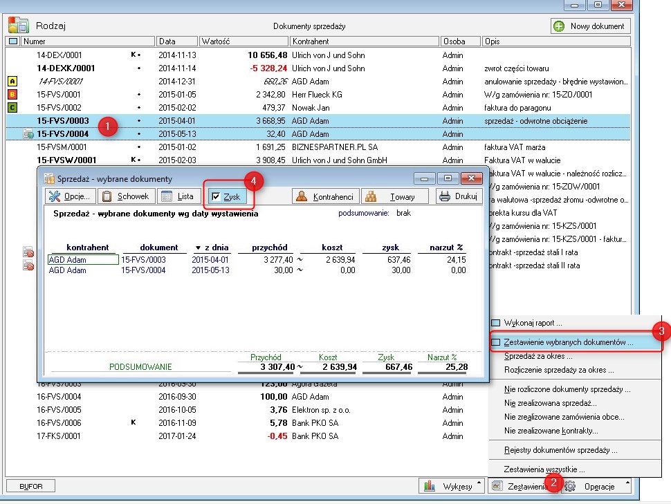 Zysk z "falką" oznacza, że nie ma jeszcze do tych transakcji dokumentów magazynowych i rentowność liczona jest w przybliżeniu z ostatniej ceny zakupu.