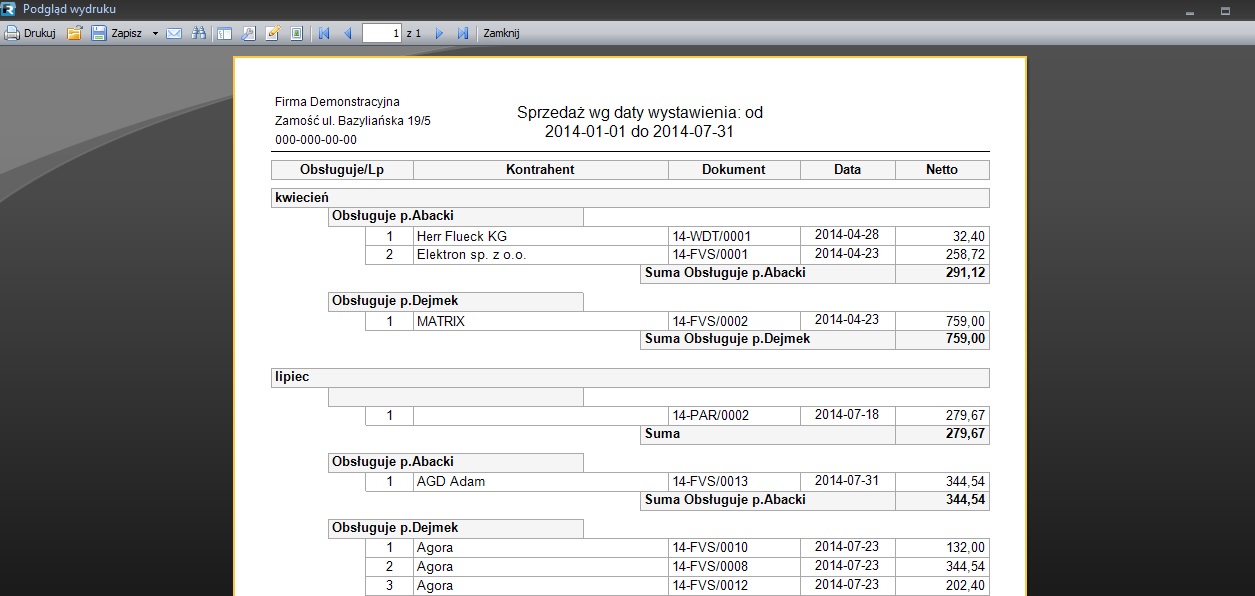 Ponadto grupowanie przykładowo faktur może być wykonane po polach faktury a nie po polach kontrahenta, który jest użyty na dokumentach.