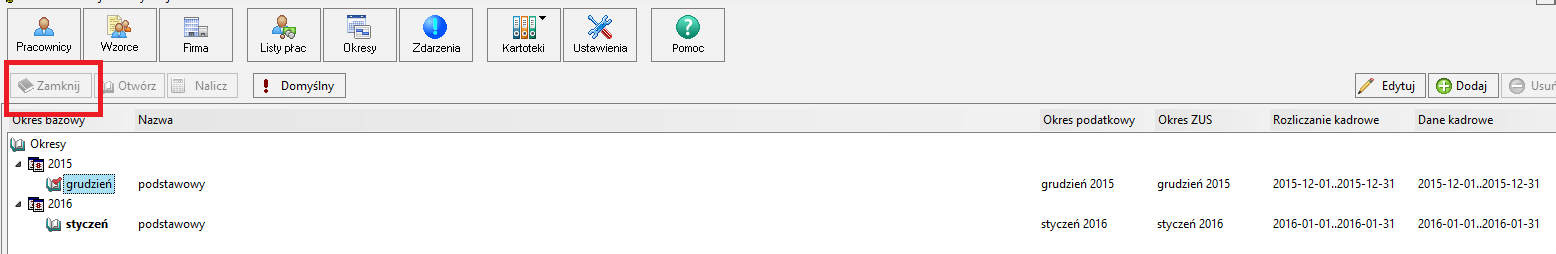 Najczęstszą przyczyną jest otwarte okno pracownika/wzorca/firmy w programie. W menu na gorze wybierz "Okno" i zamknij wszystkie aktywne okna i przycisk się odblokuje.