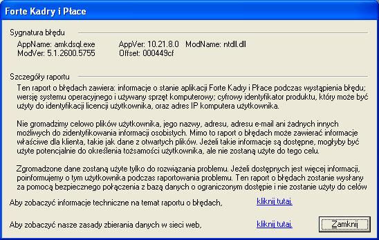 Aplikacja przestaje działać i pokazuje się poniższy komunikat.