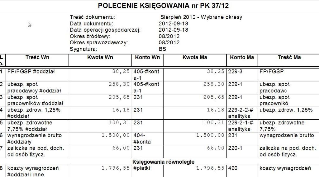 Polecenie księgowania z podziałem na oddziały.