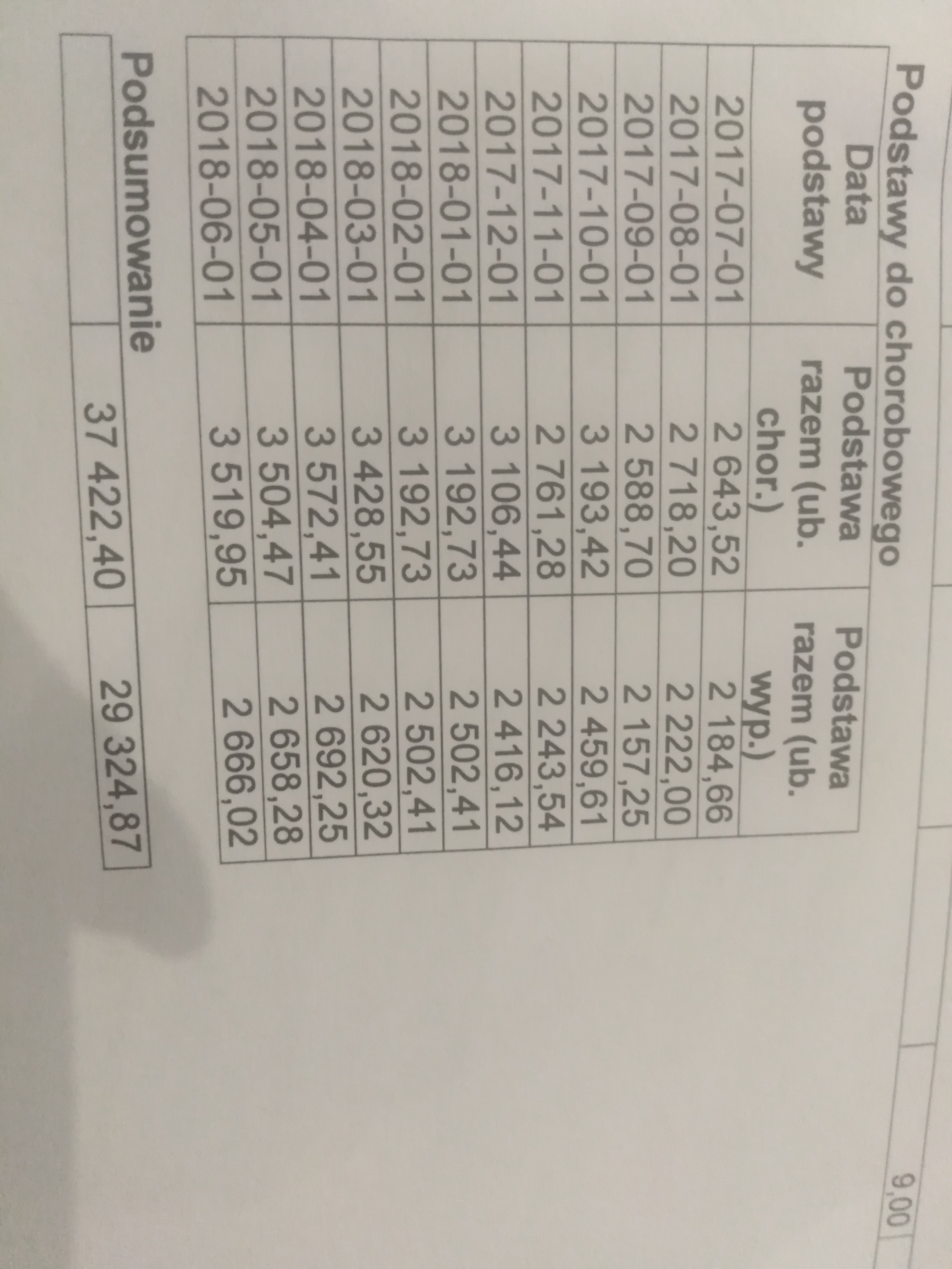 Problem mam z podstawami. W Podstawa razem (ub.wyp.) wstawiana jest kwota danego miesiąca całe brutto - 13,71% np. 2018-06-01 brutto 3.089,60-13,71%=2.666,02 a Podstawa razem (ub.chor.) wyliczane jest tak: w czerwcu byla premia 900,00+wynagrodzenie urlopowe 89,60=989,60-13,71%=853,93+2.666.02=3.519.95 i tak mi wyliczył wszystkie 12 miesiecy do podstawy i bierze do wyliczenia stawki za dzien sume z kolumny Podstawa razem (ub.chor.) Myslicie, ze to jest prawidlowo wyliczone...?