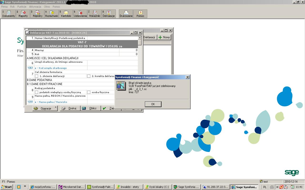 Prz próbie sporzązenia deklaracjii VAT (FKP 2011.1) pojawia się błąd jak na obrazku. Problem powstał po aktualizacji. Błąd występuje tylko przy próbie założenia nowej deklaracji. Przy przeliczaniu istniejących w buforze nie występuje. O co może chodzić