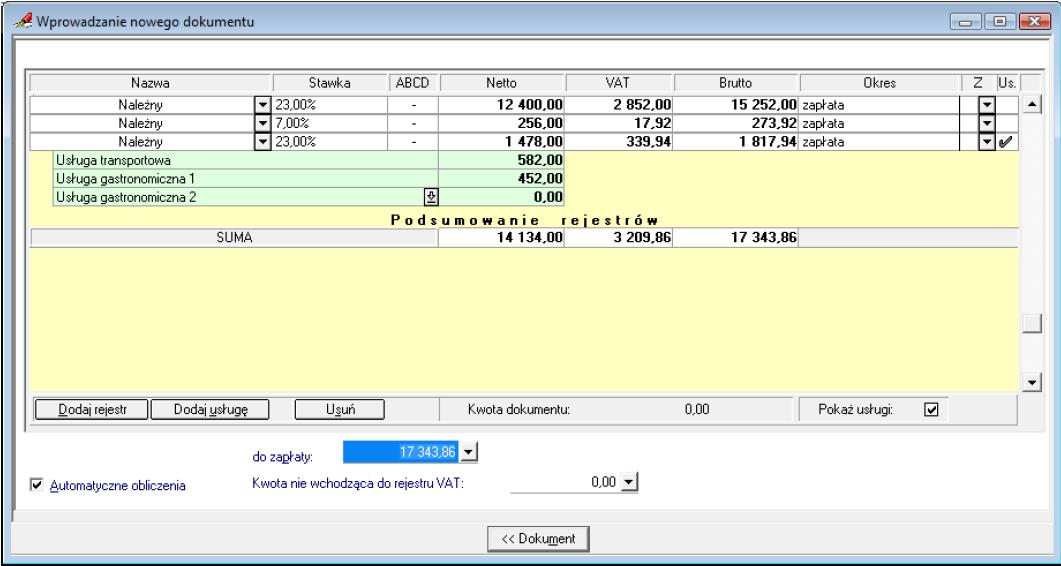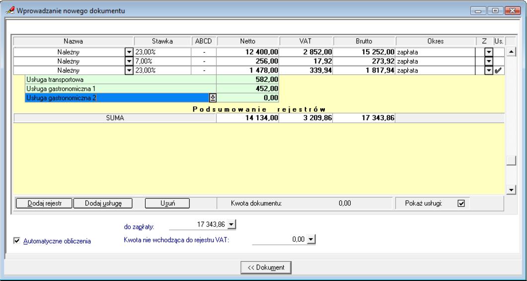 Jeżeli w definicji dokumentu zaznaczono pole Pokaż kolumnę „Usługa”, to w oknie wprowadzania /uzupełniania dokumentu, przy przejściu do widoku formularza rejestrów VAT, można dodać do rejestru nową usługę.