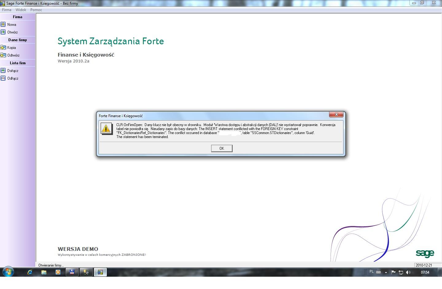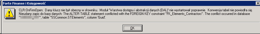 Po zalecanym uruchomieniu DBCC UPDATEUSAGE i kilku innych poleceń udaje mi się przeprowadzić konwersję bazy bez jakiegokolwiek komunikatu błędu z tym, że i tak wyświetla go FKF po uruchomieniu się. Nadal liczę na to, że uda mi się skonwertować bazę we własnym zakresie, bez konieczności skorzystania z usług firmy Sage. Może macie jeszcze jakiś pomysł?