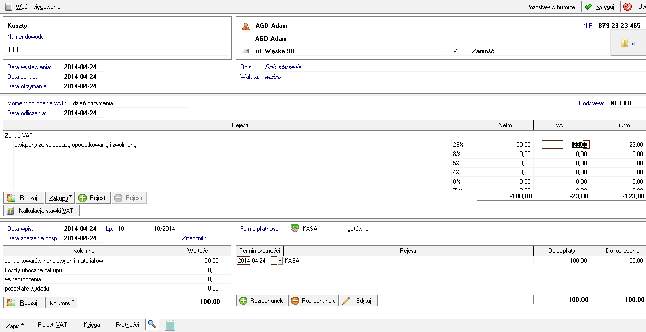 Mam do Państwa pytanie odnośnie nowej wersji Małej Księgowości 2014a. Mianowicie w tej wersji programu, podczas tworzenia dokumentu zakupu czyli kosztowego kiedy w polu ZAKUP VAT związany ze sprzedażą opodatkowaną i zwolnioną wpisuję kwotę -100 zł netto, czyli -123 brutto, to na dokumencie płatności pojawia mi się tylko kwota 100 zł.