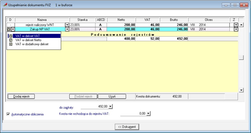 Podziel rejestr w oknie wprowadzania danych do rejestru VAT obsługuje tą sytuację