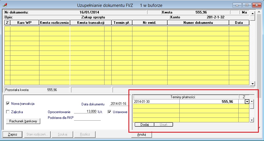 Aby stworzyć system ratalny musimy rozliczyć tę podstawową transakcję z dokumentu na kwotę Brutto.