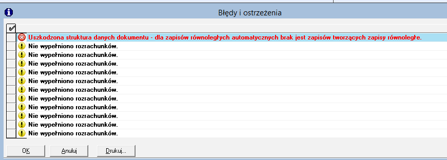 Uszkodzona struktura danych dokumentu - dla zapisów równoległych automatycznych brak jest zapisów tworzących zapisy równoległe
