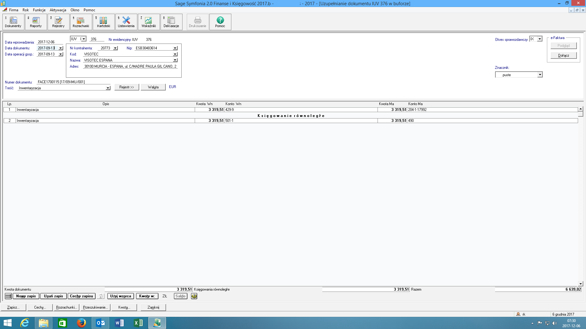 Po zaimportowaniu tego pliku okres wchodzi 10 a powinien byc 11 Kod: INFO{ Nazwa programu ='Sage Symfonia HANDEL © 2011.1' Handel Premium 2011.1 Wersja_programu =91 Wersja szablonu =3.1 dane_z_oddzialu =1 Kontrahent{ id =-1199895893 kod =DEMO_HM nazwa =Firma Demonstracyjna miejscowosc = ulica = dom = lokal = kodpocz = rejon = nip = tel1 = tel2 = fax = email = www = } } Kraj{ symbol = nazwa = aktywny = ue = } Kontrahent{ id =10669 kod =REVMAC LIMITED nazwa =REVMAC LIMITED miejscowosc =Limerick ulica =Lonsdale House, Lonsdale Rd, Nation dom = lokal = kodpocz =V94 RT7C rejon = nip = statusUE = regon = pesel = tel1 = tel2 = fax = email = www = bnazwa = bkonto = krajKod =PL krajNazwa =Polska } Dokument{ anulowany =0 rodzaj_dok =zakupu naliczenie_VAT =0 kod =00033671 data =2017-10-31 00:00:00 datasp =2017-10-31 00:00:00 datawpl =2017-11-03 00:00:00 dataokr =2017-11-01 00:00:00 KontoKasy = Dane sprzedawcy{ khid =10669 khnip =IE6340007O } kwota =290,600000000 Sygnatura =import SaldoPRK = SaldoZRK = NazwaKor = DataKor = waluta =EUR wkwota =290,600000000 kurs =4,123400000 symbol FK =IUV obsluguj jak =FVZ FK nazwa =00033671 opis FK = Zapis{ strona =WN kwota =290,60 konto =403-1-3-4 IdDlaRozliczen =1 opis =REVMAC LIMITED NumerDok =00033671 Pozycja =0 ZapisRownolegly =0 waluta =EUR wkwota =290,60 kurs =4,1234 dataKPKW = } Zapis{ strona =MA kwota =290,60 konto =210-1-2-10669 IdDlaRozliczen =2 opis =REVMAC LIMITED NumerDok =00033671 Pozycja =0 ZapisRownolegly =0 waluta =EUR wkwota =290,60 kurs =4,1234 dataKPKW = } Zapis{ strona =WN kwota =290,60 konto =505-1-3-4 IdDlaRozliczen =3 opis =REVMAC LIMITED NumerDok =00033671 Pozycja =1 ZapisRownolegly =33 waluta =EUR wkwota =290,60 kurs =4,1234 dataKPKW = } Zapis{ strona =MA kwota =290,60 konto =490 IdDlaRozliczen =4 opis =REVMAC LIMITED NumerDok =00033671 Pozycja =1 ZapisRownolegly =33 waluta =EUR wkwota =290,60 kurs =4,1234 dataKPKW = } Rejestr{ Skrot =rSPV Nazwa =IUV Rejestr należny Rodzaj =0 ABC =1 metoda_VAT =0 okres =2017-11-01 stawka =0 brutto =290,600000000 netto =290,600000000 vat = usluga = ue = nettoWaluta =290,600000000 vatWaluta = bruttoWaluta =290,600000000 } Transakcja{ IdDlaRozliczen =-1 Termin =2017-11-14 00:00:00 } Rozliczenie{ IdDlaRozliczen =-1 dSymbol =00033671 kwota =290,600000000 } }