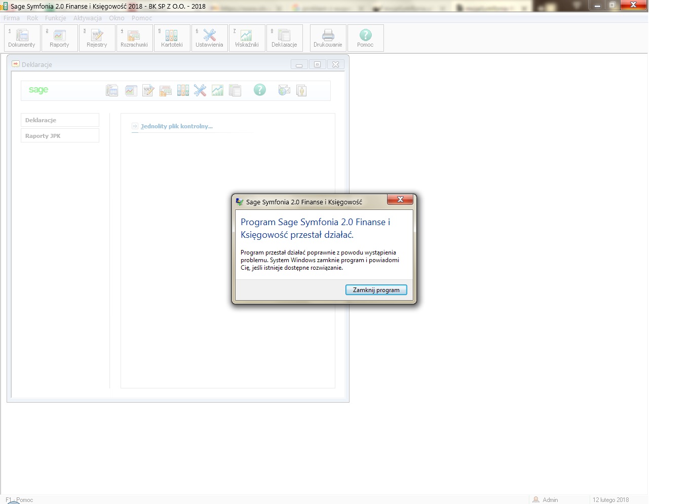 Dzień Dobry, Pracuję na Sage Symfonia 2.0 Finanse i Księgowość- wersja18.0.6.0. Chciałam dziś wygenerować JPK VAT za styczeń 2018r., ale przy próbie zapisania wywala mnie z programu. Symfonia przestaje działać. Przy generowaniu JPK VAT za 2017r. problem nie występuje- plik generuje się bez problemu. Ktoś coś poradzi? Czy to coś z tą wersją jest nie tak czy może ustawienia ???