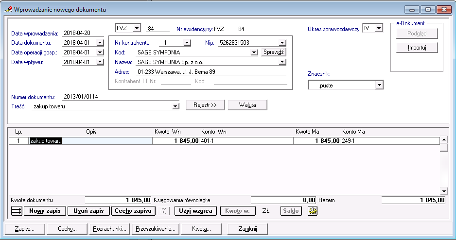 Witam! Mam fakture zaliczkową i rozliczam z niej VAT. Następnie otrzymuję fakturę końcową, która rozlicza tę zaliczkową - VAT na 0,00, tylko koszt. W jaki sposób wprowadzic do programu fakture rozliczającą na zero ? FK 2018. Dzięki AGA