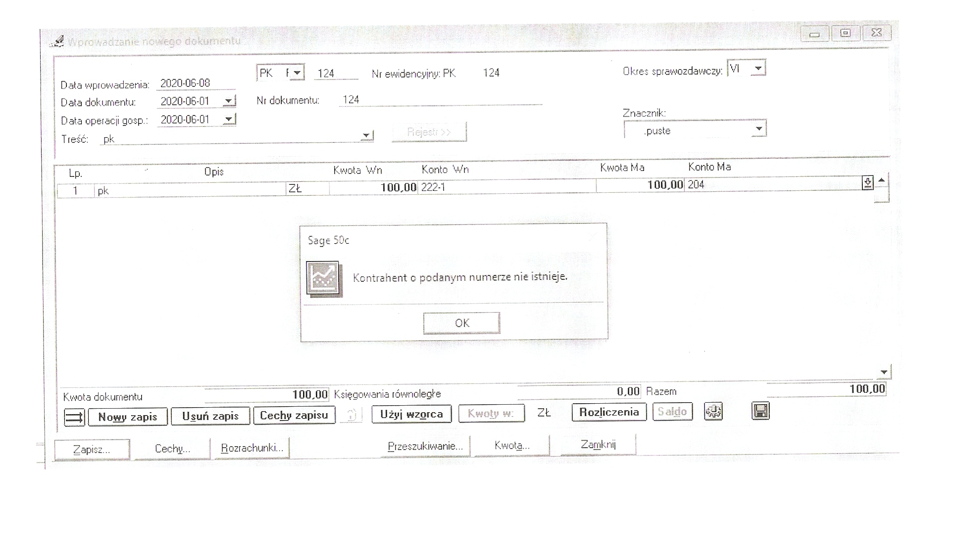i jeszcze jeden komunikat, pojawił się przy wprowadzaniu wyciągu bankowego, ale występuje też przy innych dokumentach - mimo, że kontrahent nie jest wskazany na żadnym koncie wyskakuje komunikat: kontrahent o podanym numerze nie istnieje