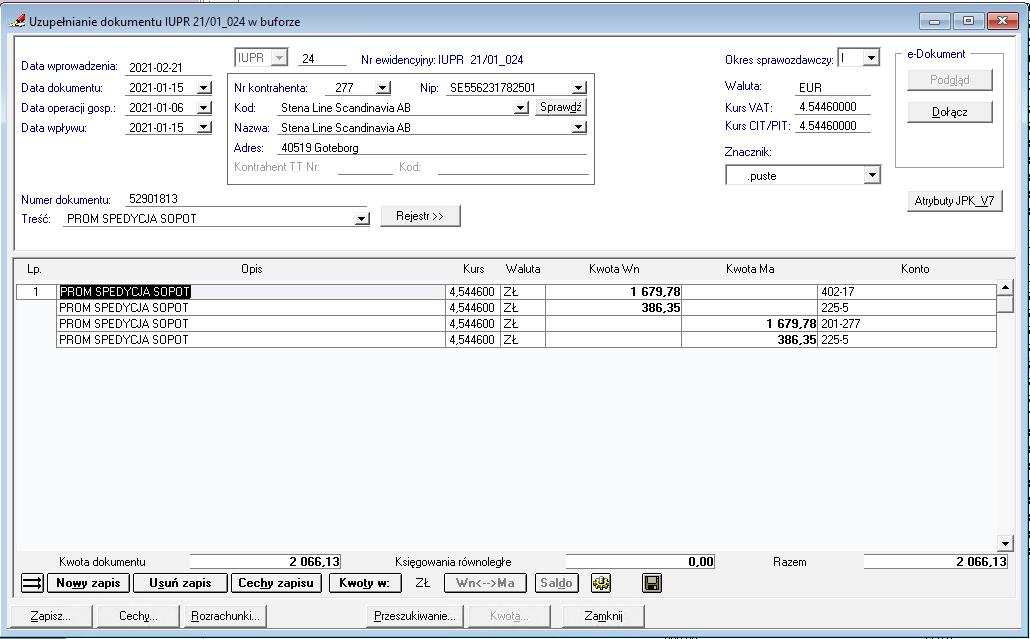 Importuje dokumenty dotyczące importów usług w formacie 3.0. Niestety dane wyjściowe nie posiadają zapisów dotyczących kwot VAT tj jest tylko dekret netto=brutto. Po modziłem szablon importu jak poniżej i w tej chwili już od trzech lat działa zgodnie z oczekiwaniami a z dekretami kwot VAT na poszczególne konta poszedłem na "skróty"i zapisy maja dekret: Kod: 402-X / 201-K 225-5 / 225-5 I teraz mam potrzebę aby zapisy VAT były po stronie WN na 225-1, a po stronie MA 225-2 czyli tak: Kod: 402-X / 201-K 225-1 / 225-2 Znajdzie się jakaś mądra dusza i mnie naprowadzi jak to wykombinować? Ja niestety jestem za cienki w uszach Poniżej kawałek szablonu jaki funkcjonuje na ten moment: Kod: case "zapis" MakeSec("zapis") { $strona = Rex([strona], "MA", 1) //WN=0 (""), MA=1 $kwota = [kwota] $Konto = [Konto] $NumerDok = [NumerDok] $IdDlaRozliczen = [IdDlaRozliczen] // if ( Equal(@@opisy, 1) ) // { // $Opis = [opis FK] // $typopisu = 1 //opis bezpośrednio // } IF ( NOT(equal([waluta], "")) ) { $wkwota = [wkwota] $waluta = [waluta] $kurs = [kurs] $typkursu = 3 } } MakeSec("zapis") { $strona = Rex([strona], "MA", 1) //WN=0 (""), MA=1 $kwota = Mul2 ( [kwota], 0.23) $Konto = "225-5" //$NumerDok = [NumerDok] //$IdDlaRozliczen = 3 //if ( Equal(@@opisy, 1) ) //{ // $Opis = [opis] // $typopisu = 1 //opis bezpośrednio //} IF ( NOT(equal([waluta], "")) ) { $wkwota = Mul2 ( [wkwota], 0.23) $waluta = [waluta] $kurs = [kurs] $typkursu = 3 } } break |