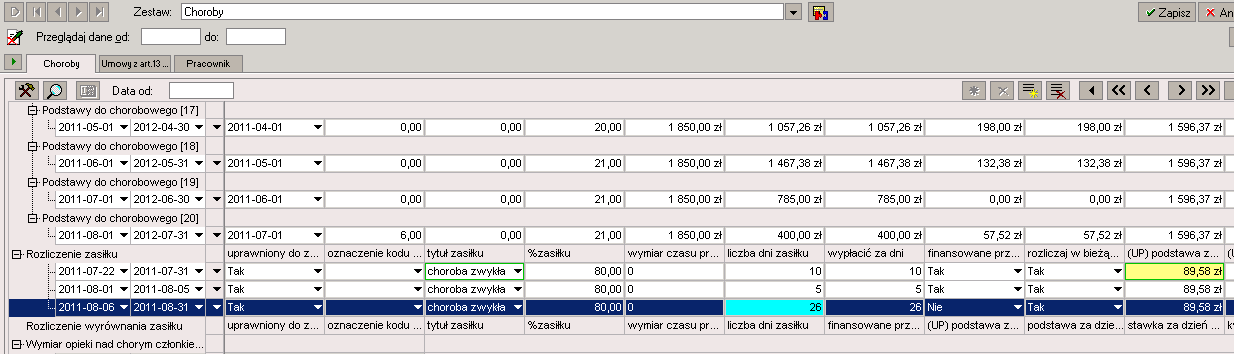 A jakie masz wartości w [Bilansie chorób pracownika] dla 2011 roku w polach [korekta choroby] oraz [dni choroby płatne przez zakład]?