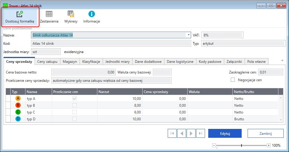 Generalnie jak włączysz IsDesignModeAvailable na true w pliku CustomizationParams.xml będziesz miał dostęp do narzędzi. Kod: <CustomizationParams> <IsDesignModeAvailable>true</IsDesignModeAvailable> <IsDebugMode>false</IsDebugMode> <ReportCompileAndRuntimeErrors>false</ReportCompileAndRuntimeErrors> <OutputAssemblyPath/> <CheckCompilationOnValidation>true</CheckCompilationOnValidation> </CustomizationParams> W oknie Towaru dostępne będzie nowe menu Załącznik: